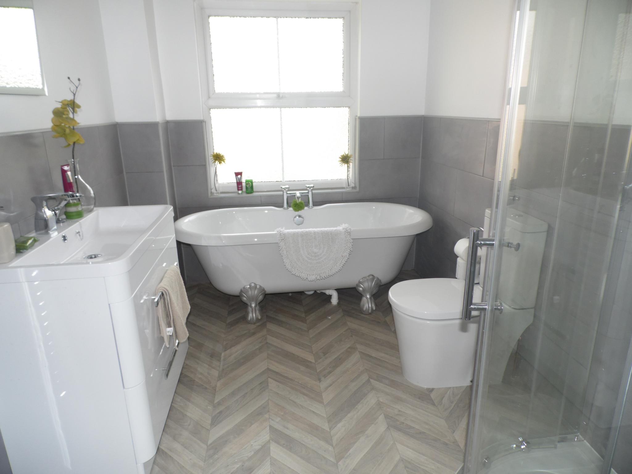 This well presented 2 bedroom end of terrace property comprises of entrance storm porch, spacious, light and airy living room, open plan dining room with feature wood burning stove and stairs leading to the first floor. Fitted high gloss kitchen with built in oven, ceramic hob and extractor hood, PVC French doors opening to the enclosed rear garden and side aspect window. Leading from the landing area there are two good size bedrooms and a beautifully presented 4 piece bathroom suite comprising of roll top bath, vanity sink and WC with separate shower cubicle. Externally there is a laid to lawn garden to the front, enclosed laid to lawn rear garden with side access gate leading to the larger than standard detached garage.